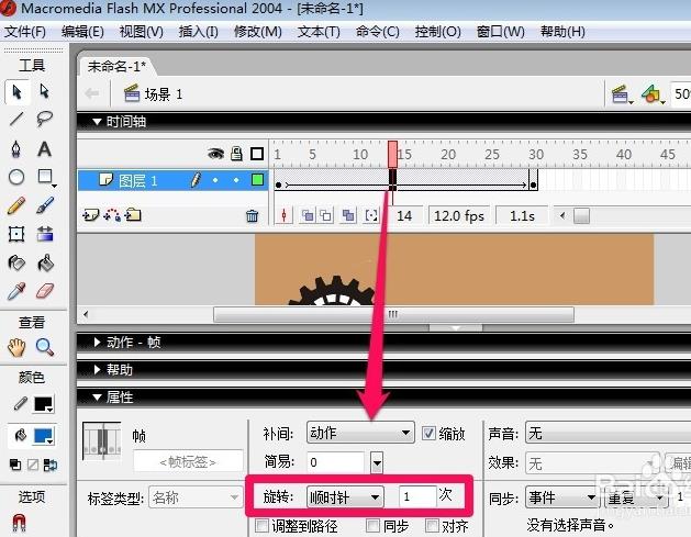 8、这里选择动作补间动画,然后设置好旋转的方向和次数,这样就完成了。