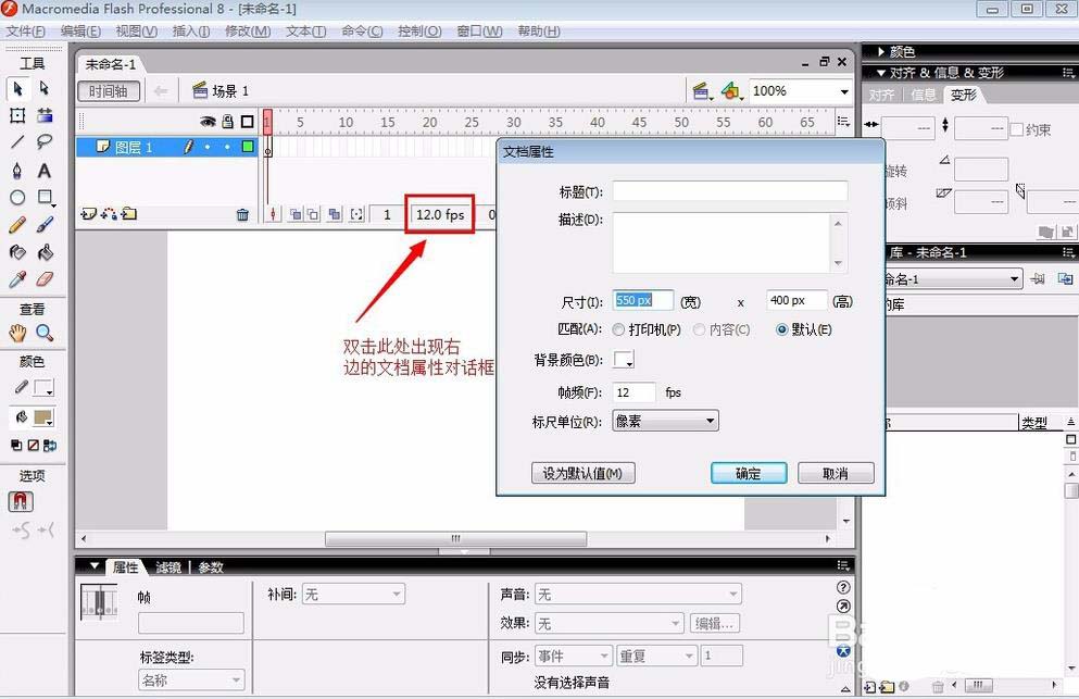 4、在弹出”文档属性“对话框中可以看到如图所示的帧频(f):12fps 的设置,直接修改框里的数值,然后点”确定“,修改完成。如果想动画快数值要变大。一般常见设置24的比较多。