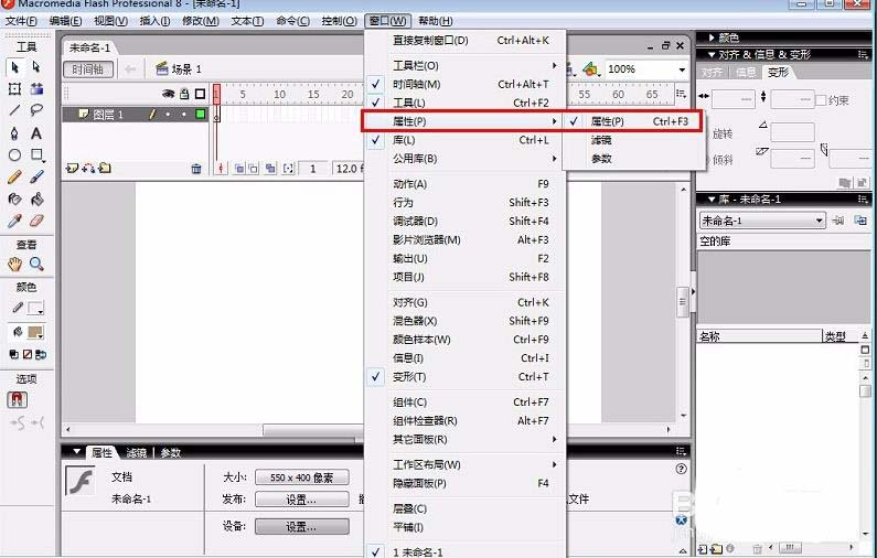 6、“属性”面板的添加,需要打开工具栏上面的”窗口“—”属性“然后左移鼠标勾选”属性“,如下图所示。或者直接按”ctrl+f3“。