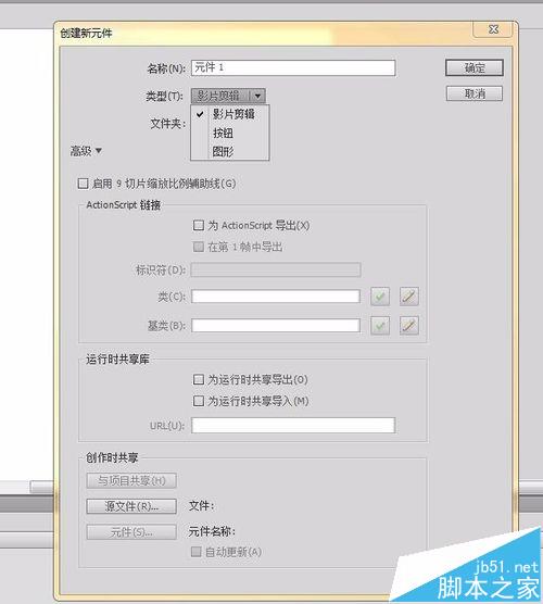 7、上面的操作同样会弹出第一种方法中的窗口,选择影片剪辑,点击确定即可。另外,还可以将库里的位图、按钮、视频等元件拖到舞台后转换为影片剪辑。