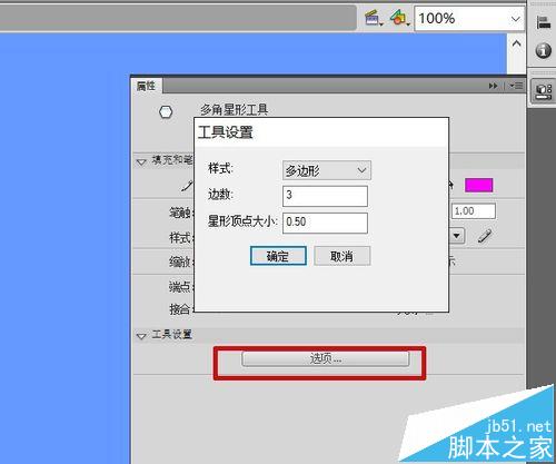 2、属性面板中点击”选项“按钮,在弹出的面板中将样式设为”多边形“,边数3。