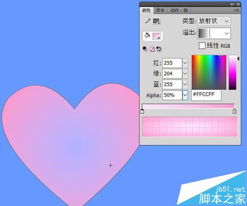 5、颜色面板中将填充色类型改为放射状,填充条如图设置。第一个颜色alpha值改为50%。选中线条,删除(或者用橡皮擦的水龙头去除线条)。