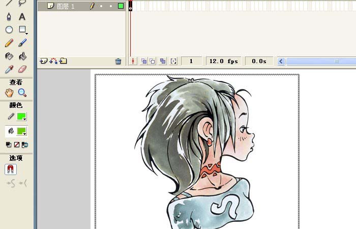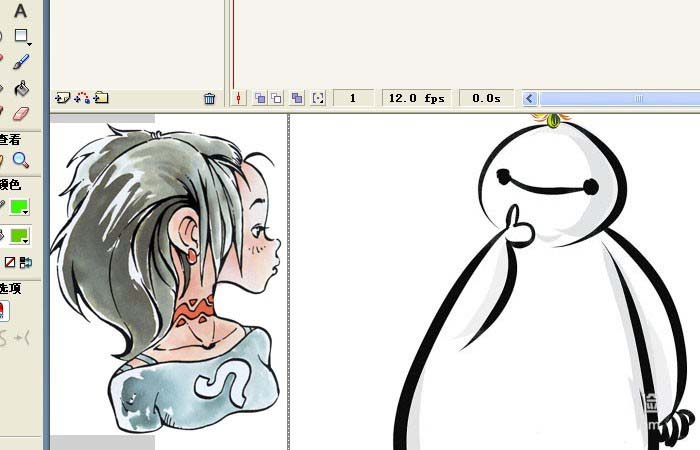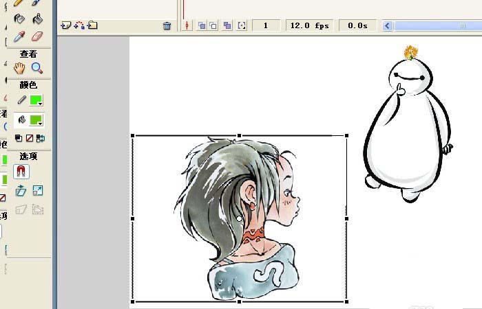 6、把人物图片也进行缩小的操作,这样导入的两张图片都在画布的区域里了,鼠标左键拖放来调整图片的位置,这里把人物图形放在左下方,这样看起来美观些,如下图所示。然后,鼠标左键单击菜单下的【控制】>>【测试影片】,可看到运行的结果。一个简单又好看的动画图形就做好了。