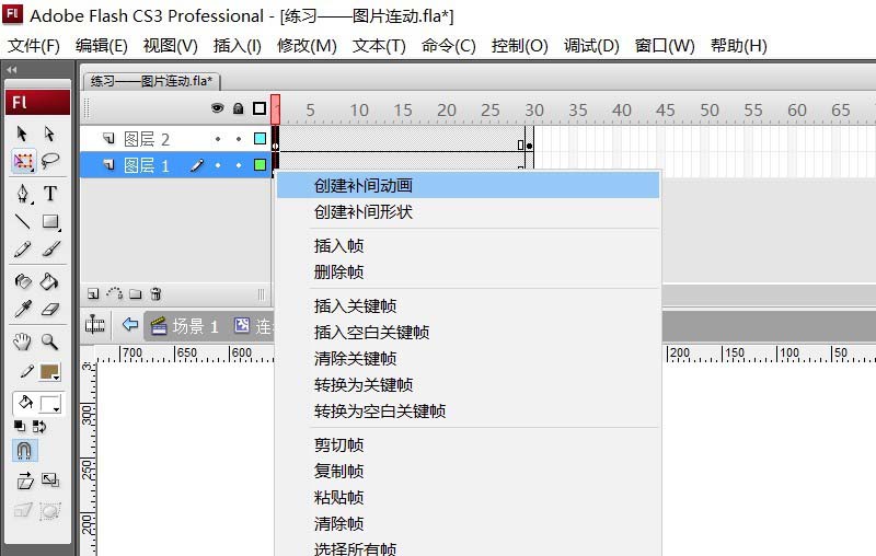15、回到图层1第30帧,拖动图1元件右边框至左边,使其成为一线。