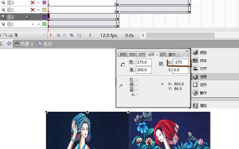16、图层2帧1、30的元件换成图2。信息面板中帧1元件X方位改为-275(与图1左边对齐),拖动左边框至右边。同理将其余图层的元件分别换成元件图2、3|3、4|4、5|5、6,图层13的元件换成图1,形成图片连动的联接。并分别对单层的最后一帧和双数层的第一帧元件改动。