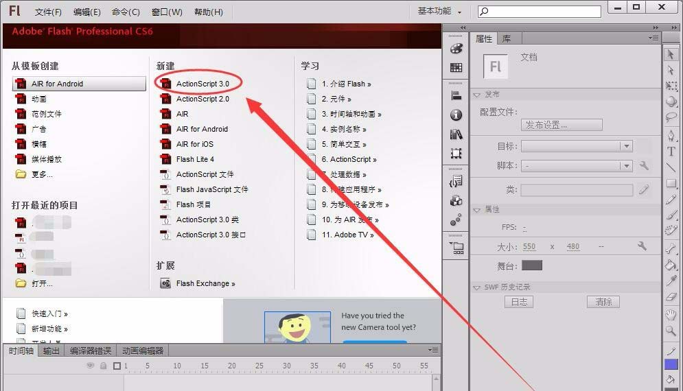 1、打开Flash软件,选择“ActionScript3.0”,新建一个空白文档。
