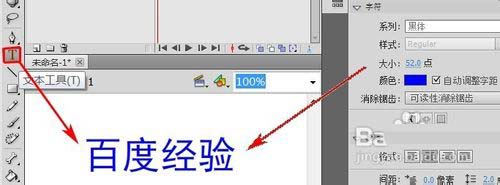 3、在工具栏选择“文本工具”,在舞台输入文字“百度经验”