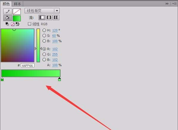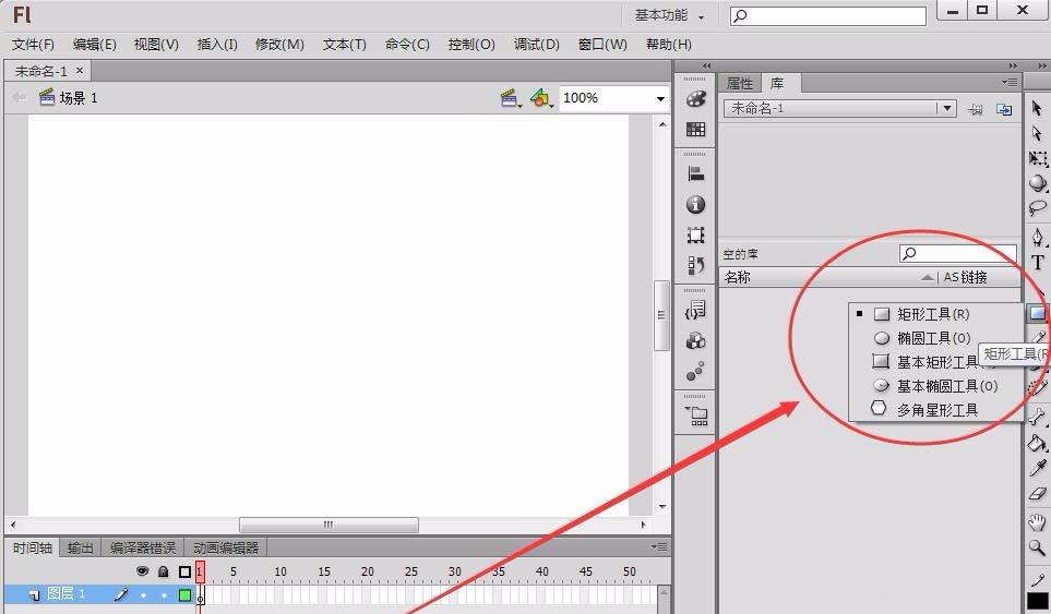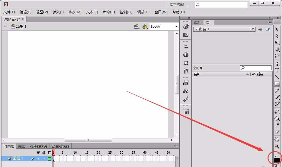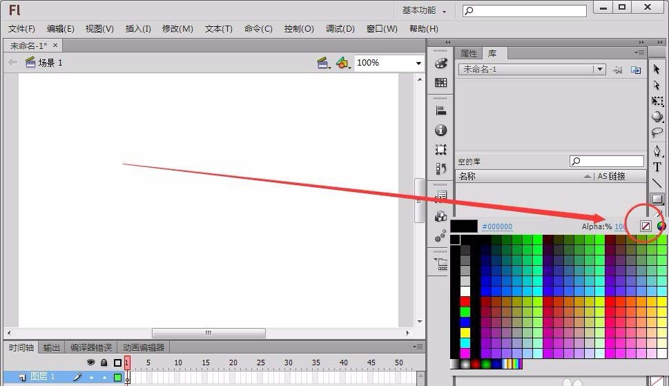 4、选择“填充色”,设置填充的颜色,也可在“颜色”面板中设置填充颜色,在舞台绘制一个矩形。