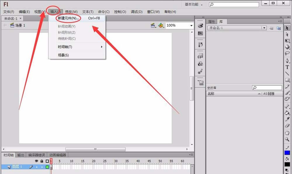 1、单击“插入”---->“新建元件”,新建一个图形元件。