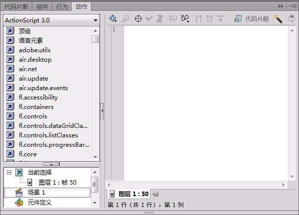6、在第一行输入“stop();”而且下方的“场景1”中也会添加一个“图层1:帧 50”