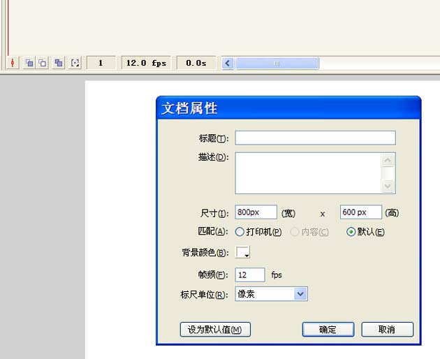 1、首先启动flash8,执行文件-新建命令,新建一个大小为800*600,帧频为12fps,背景颜色为白色的文档。