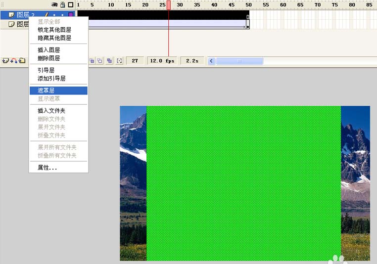 5、右键单击图层2,从下拉菜单中选择遮罩层,将图层2设置为遮罩层,图层1为被遮罩层。