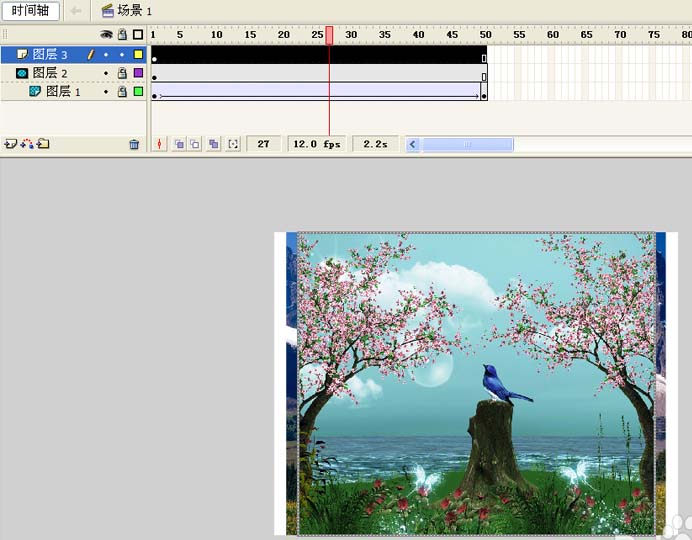 6、新建图层3,从库中拖拽一张图片到舞台上,设置大小为800*600,并设置全居中(水平居中、垂直居中)