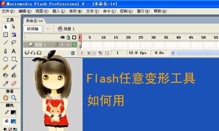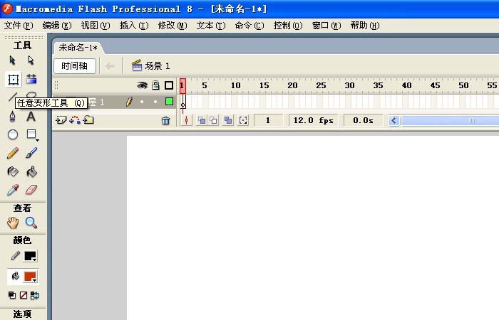 1、打开Flash软件(这里用的Flash8.0版的软件)。可看到软件的界面,绘制动画在舞台画布上制作,这里鼠标选择工具栏上的任意变形工具,如下图所示。