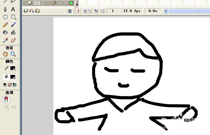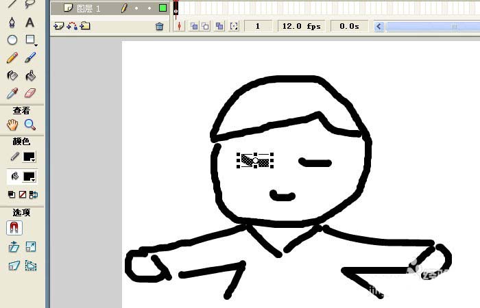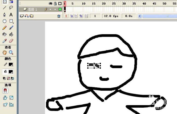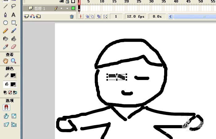 6、接着,取消选用的任意变形工具,查看卡通男孩图形的改变,眼睛的曲线旋转了,并且拉长了,如下图所示。