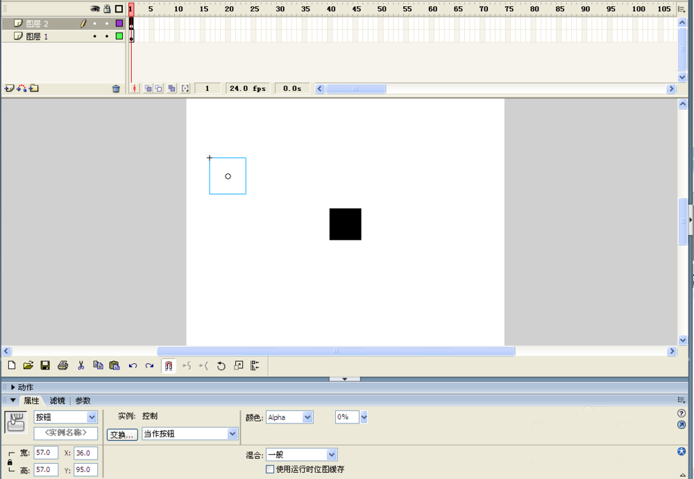 10、按F9退出编辑,然后再次选中按钮元件,在属性栏中将颜色选项选为Alpha,把值设为0%
