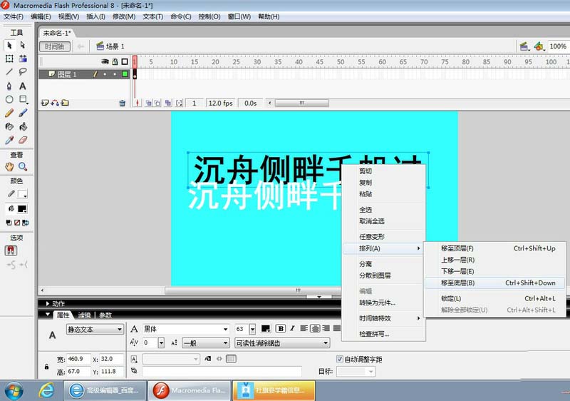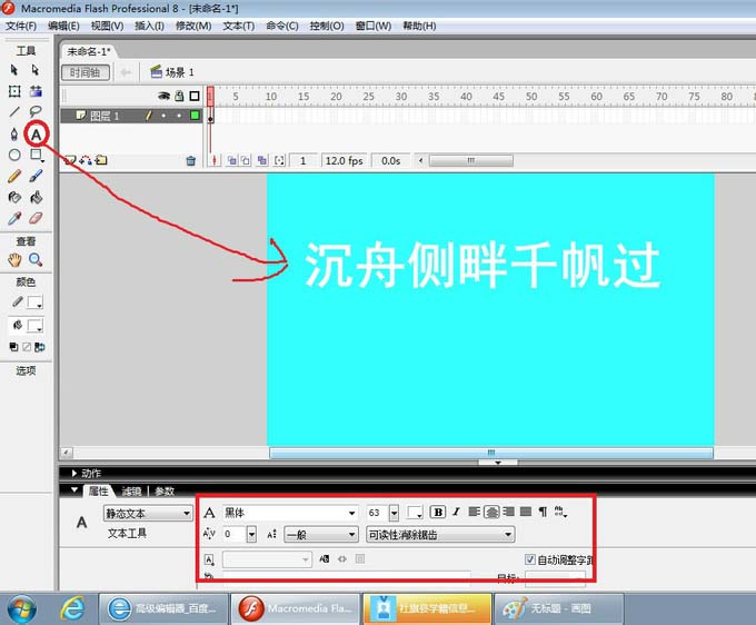 3、利用左侧工具箱中的文本工具,在舞台中输入文本“沉舟侧畔千帆过”,如图,在属性上把字体设置成黑体,字的颜色为白色。