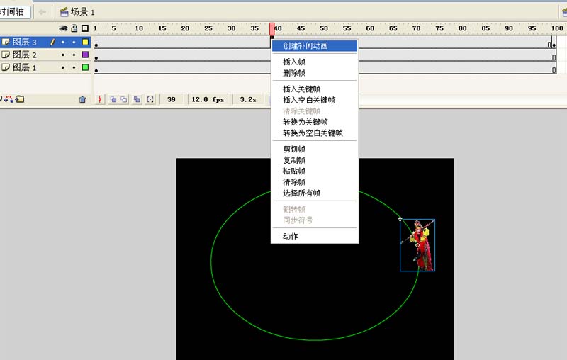 7、在图层3的第100帧处插入关键帧,其他两个图层插入帧,将影片剪辑文件拖拽到开口处下端,在1-100帧中选择任意一帧,右键单击从下拉菜单中选择创建传统补件动画,并在属性里勾选同步和调整到路径。