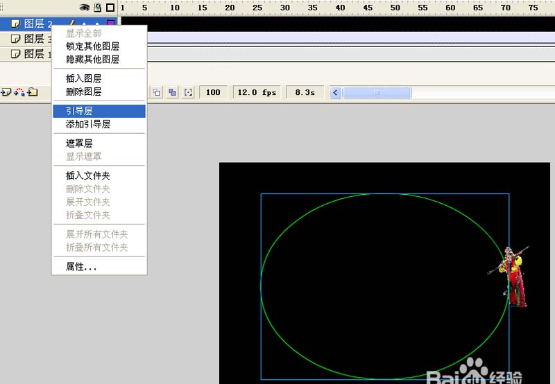 8、交换图层2和图层3的位置,右键单击图层2,从下拉菜单中选择引导层选项,将图层2设置为引导层,图层3为被引导层。