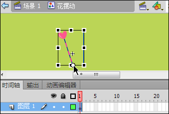 2、按Ctrl+F8快捷键新建一个图形元件,命名为“花摆动”。确定后进入元件编辑场景,将“库”面板中“花.png”图片拖入舞台当中,使用“任意变形工具”将花图形的中心点调整到花杆的根部,如图2所示。