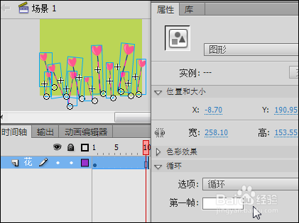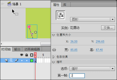 4、回到“场景1”,在“时间轴”面板上将当前图层重命名为“花”,将“库”面板中“花摆动”图形元件拖入舞台并适当调整其大小和位置,选中该实例,在“属性”面板“循环”选项“第一帧”处填写1~10的任意数字,如图4所示。