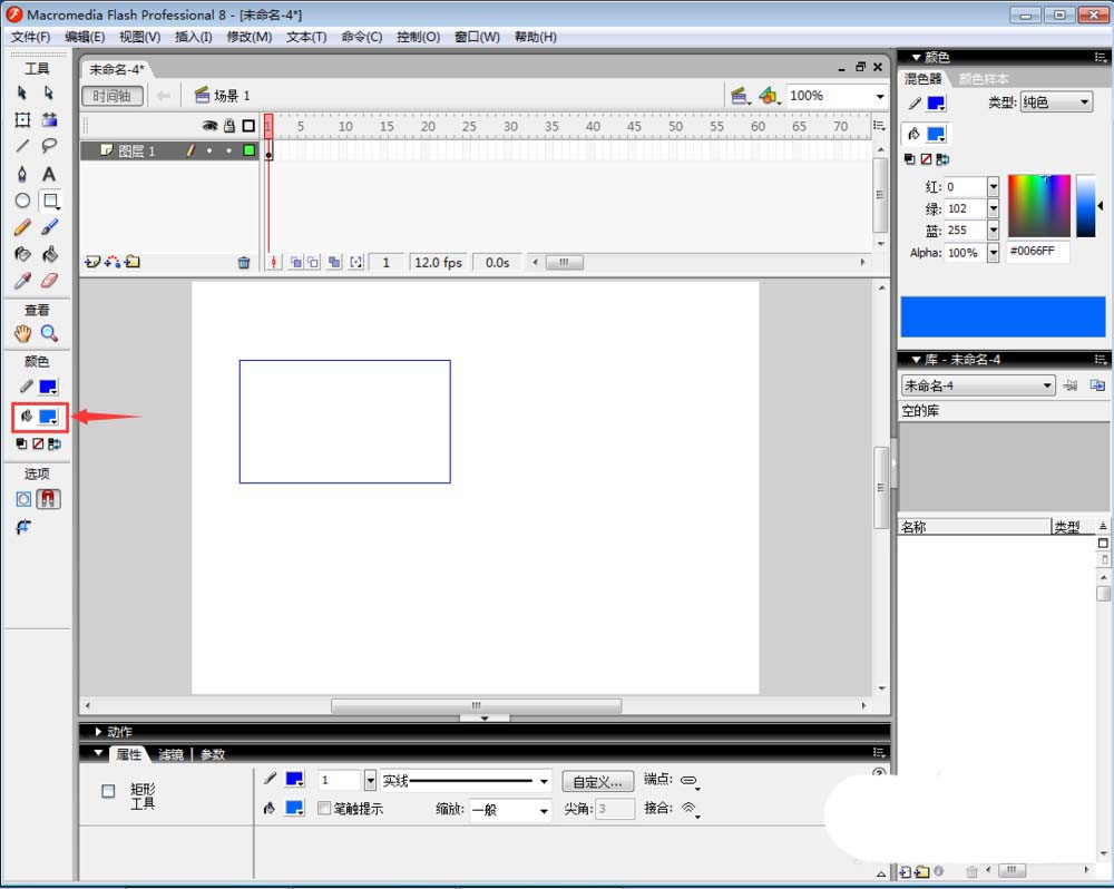 4、按住鼠标左键不放,就可以在舞台上绘制一个长方形;