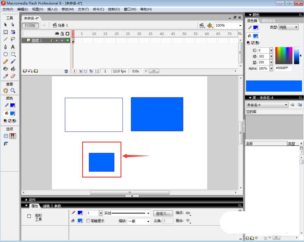 7、画长方形时,可以通过鼠标在舞台上拖动的时间长短来控制长方形的大小,拖动的时间越短,画出的长方形边长越短。