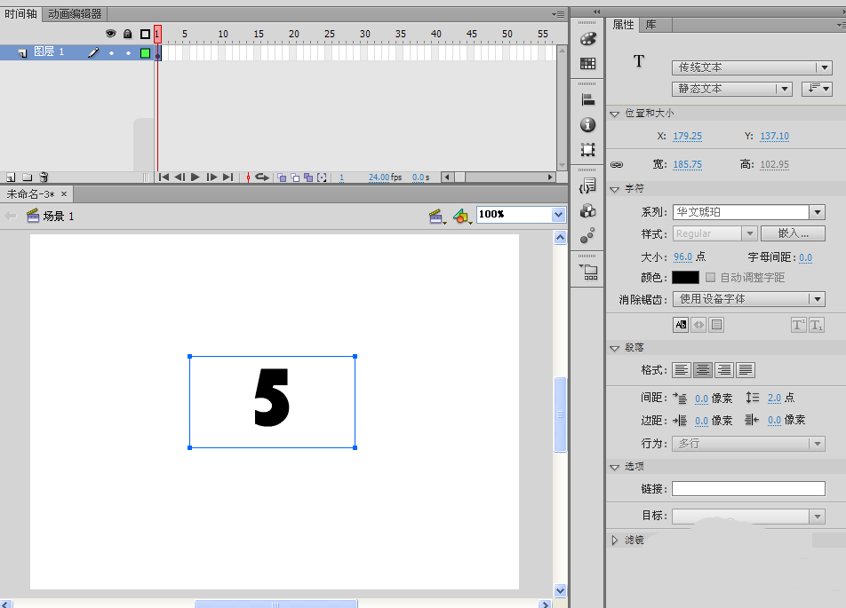 1、打开FLASH CS6,新建FLASH文档,在第一帧处,插入一个静态文本(这里小编插入一个数字“5”)