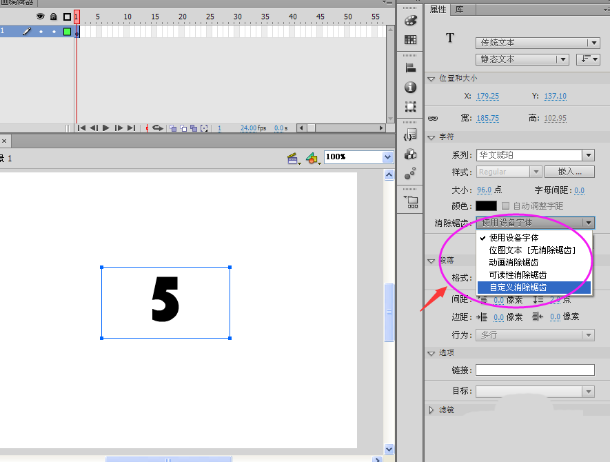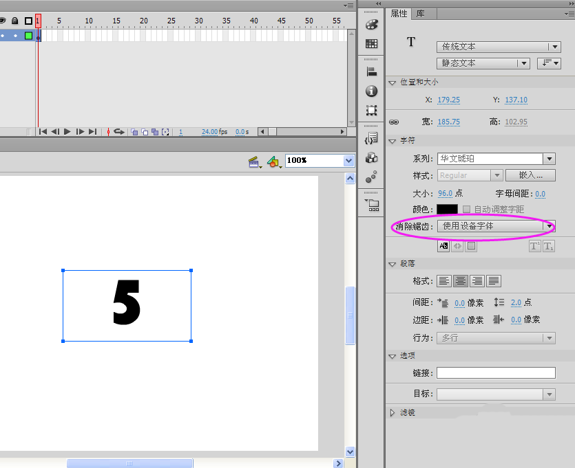 6、其实,在制作这个动画的一开始,我们就犯了一个非常细小的错误,小编个人认为这是FLASH CS6 自身的BUG,那就是在字体属性的消除锯齿一栏,我们使用了设备字体 ...