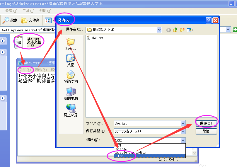 将abc.txt文档另存为UTF-8的编码方法或者其他的编码方法...
