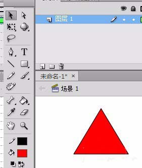 2、单击工具箱中的颜料桶工具(快捷键K),在属性面板内设置一个颜色,我这里设置为红色,然后在三角形的内部单击鼠标,以填充颜色