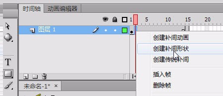 3、创建补间形状。在1到15帧之间的任意一帧上点右键,选择创建补间形状