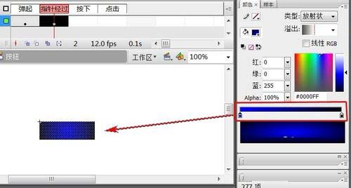 6选择“弹起”帧,用“矩形工具”绘制一个矩形,并设这个矩形边框为“无”,类型为“放射线”,填充色为“红—黑”渐变。