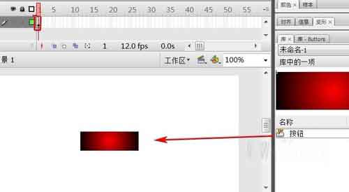 13、选择“图层1”第1帧,把按钮元件拖到场景中。