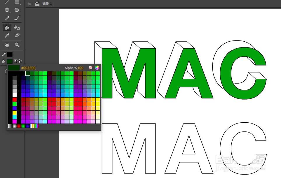 8、然后再次选中立体字母,按住CTRL+B,再按一次,将文字再次打散,因为使用了直线工具进行连接,如果没打散无法上色,选择颜料桶工具,颜色作为参考,在面上一层填充