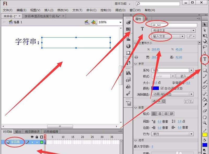 1、Flash舞台中,创建一个图层命名为“字符串”,用文本工具绘制一个输入文本框,在属性面板中,将实例名称取名为“str_txt”。