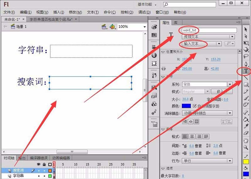 2、新建一个“搜索词”图层,使用用上一步的方法,绘制一个输入文本框,将实例名称取名为“word_txt”。