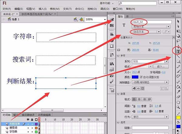 3、使用文本工具绘制一个动态文本框“判断结果”,实例名称取名为“result_txt”。