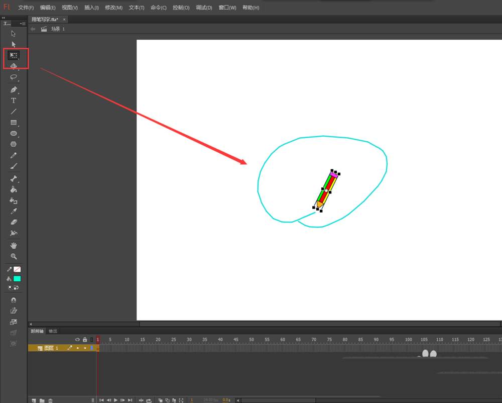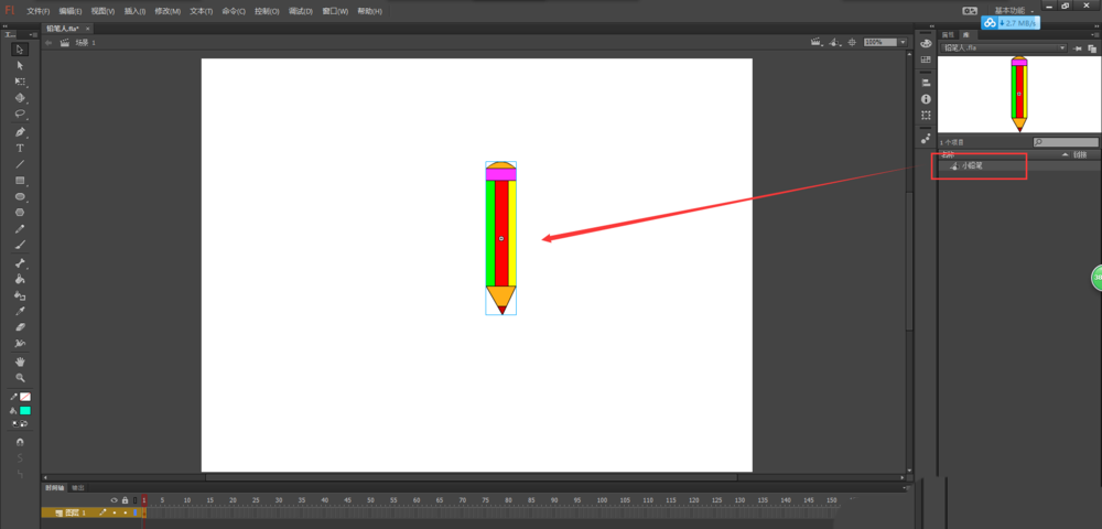 1、打开flash二维动画软件,新建一个动画项目,首先将小铅笔元件拖入到场景画布中。