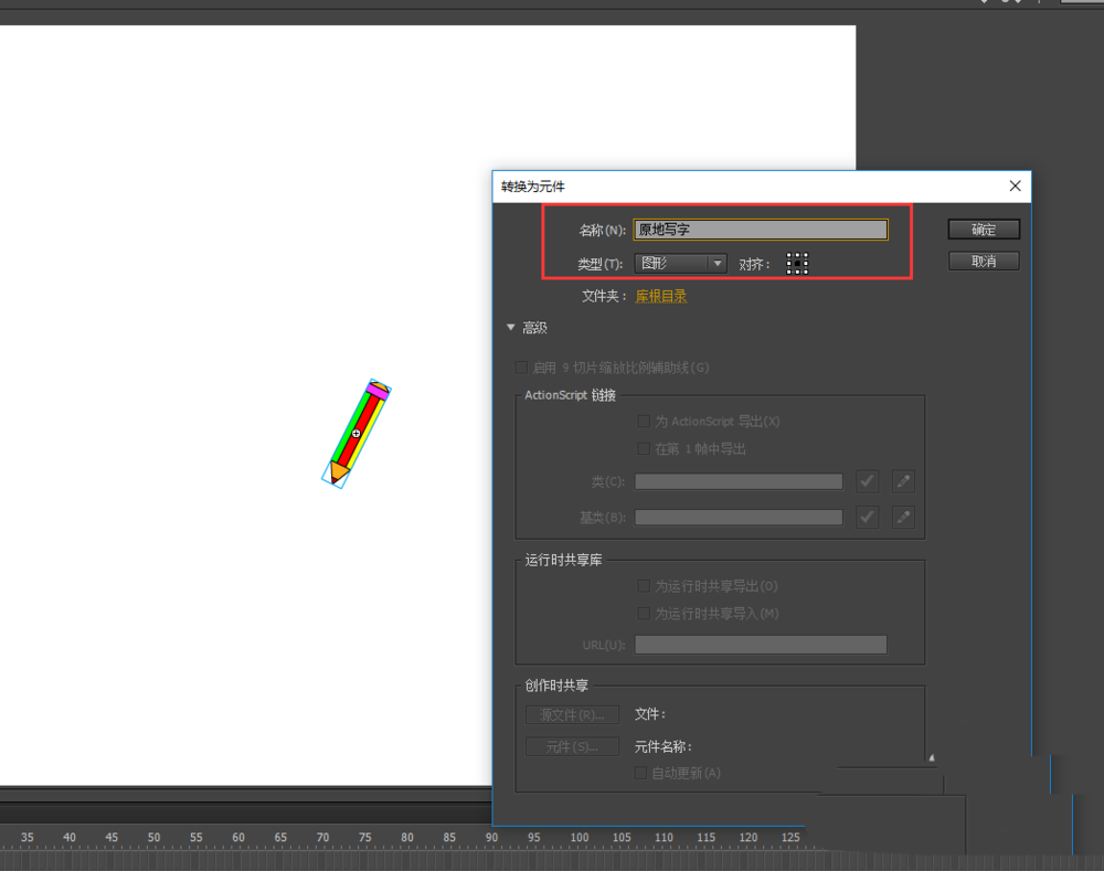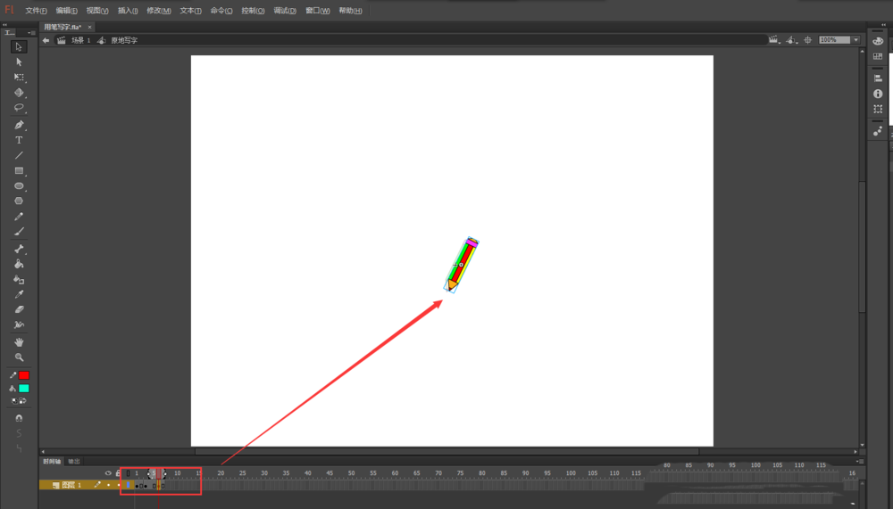 2、选择任意变形工具,将小铅笔进行缩小并旋转一定角度;然后选中小铅笔按F8将其转换为图形元件,元件命名为“原地写字”。