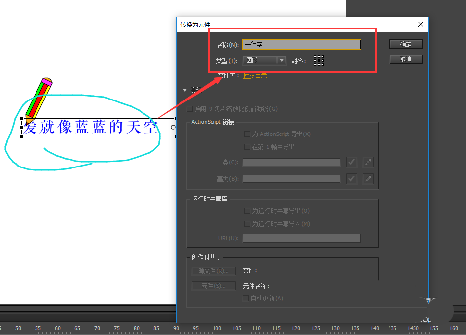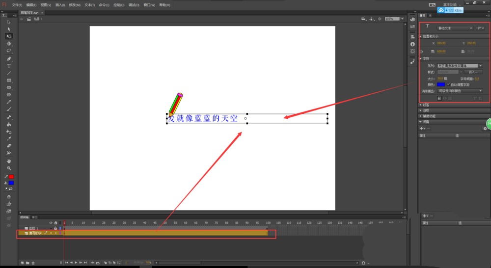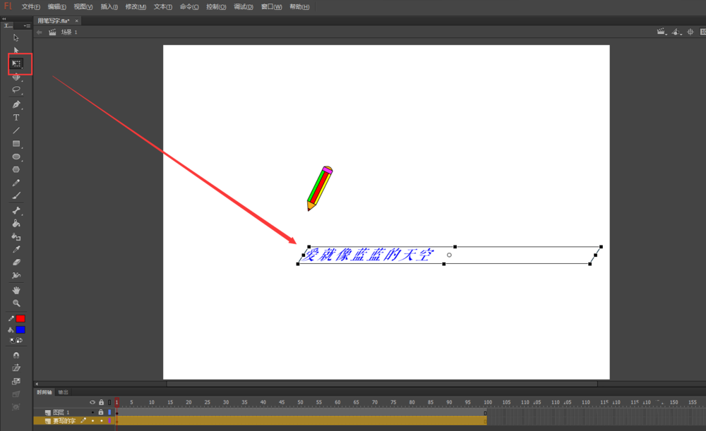 4、新建一个图层,放在图层1的下方,并命名为“要写的字”,然后在场景画布中输入要写的文字内容,并将小铅笔移到文字内容的左侧位置,然后将小铅笔图层1锁定。选中文字按F8将其转换为图形元件,命名为“一行字”。再用任意变形工具,将文字内容做一点倾斜处理。