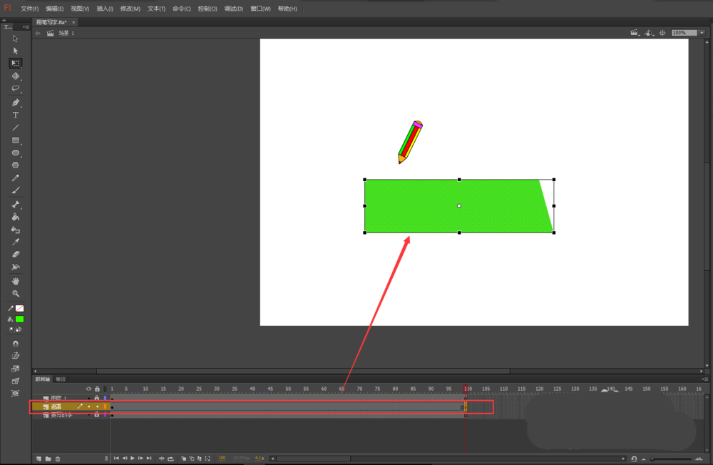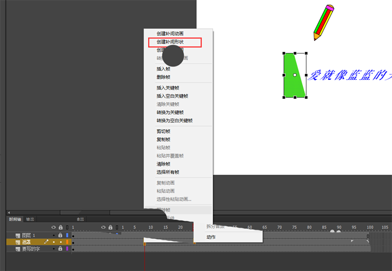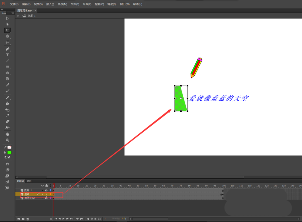 6、右键遮罩层将其转换为真正的遮罩图层,选中图层1的小铅笔,在图层1第一帧位置将小铅笔移到文字的左侧,在第100帧插入关键帧,将小铅笔移到文字的右侧,然后在第一帧与第100帧之间创建一个传统补间动画。测试动画,一个用笔写字的动画效果制作完成。