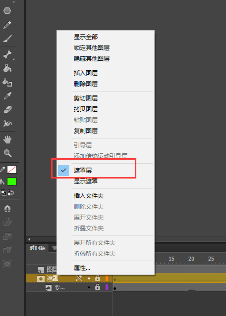 5、在新建一个图层,放在文字层上方,命名为“遮罩”;在遮罩层第一帧的位置,画出一个图形出来,放在文字的左侧;然后在第100帧位置插入一个关键帧,将图形进行拉伸,覆盖所有文字;在时间轴遮罩图层第1帧与第100帧时间右键鼠标创建一个补间形状。