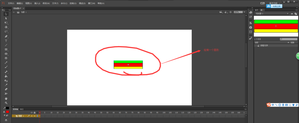 2、选择flash中工具栏中多种工具来结合使用,绘制一个矩形图形,如图所示,这个图形就充当按钮来使用。