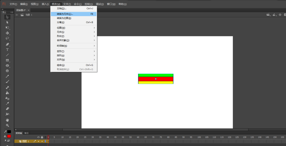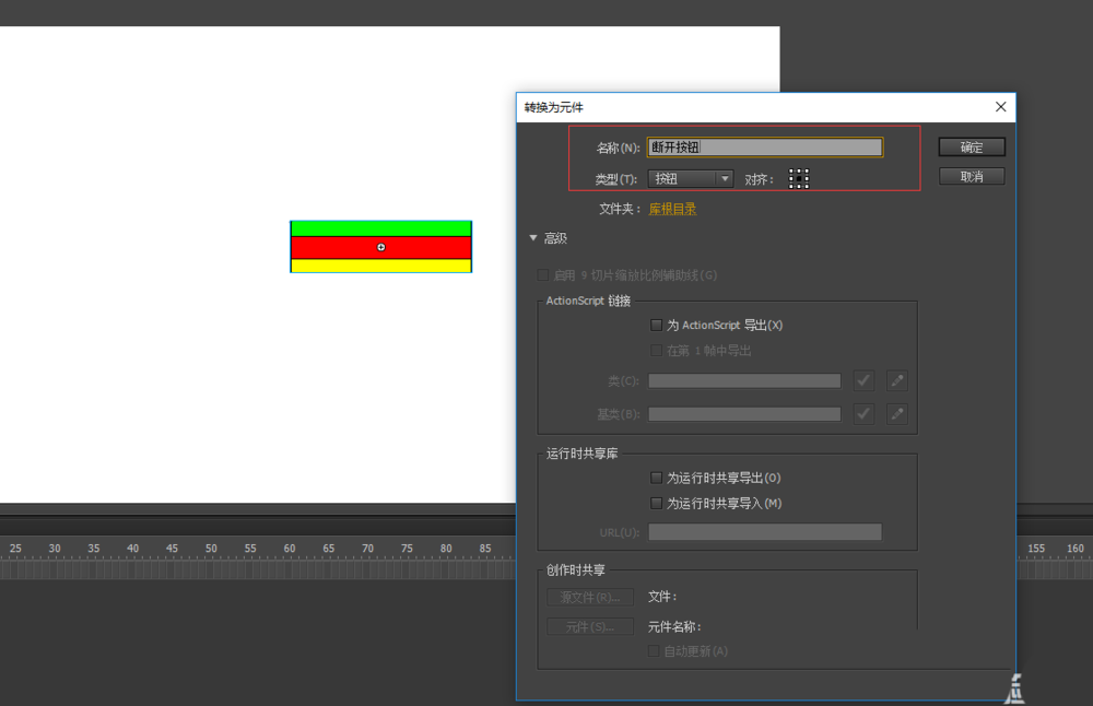 3、选中绘制好的图形按钮,选择菜单栏中修改菜单的转换为元件命令,弹出转换元件设置窗口,将当前的图形元件改为按钮元件,并重命名为“断开按钮”,单击确定。