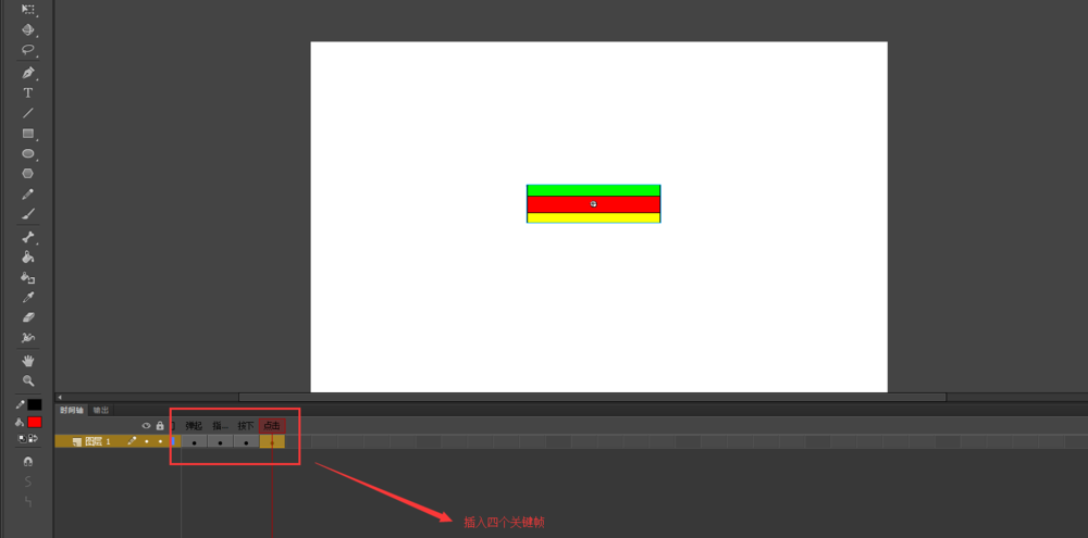 4、双击转换为按钮之后的图形,进入到按钮编辑窗口中,在按钮编辑窗口的时间轴中对应的插入四个关键帧。