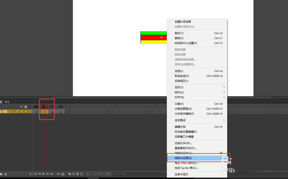 5、选中“指针”所在的那一个关键帧,右键按钮图形将其转换为位图,然后执行分离命令,将位图进一步进行打散。