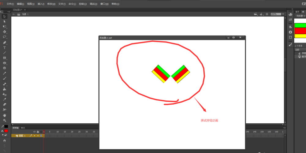 7、单击返回场景,测试按钮,当鼠标经过按钮时候,按钮就会自动断开,这样,一个鼠标单击从中间断开的按钮效果制作完成。