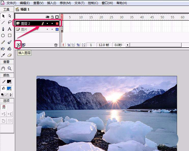 4、单击“插入图层”按钮在“图片”图层上面插入“图层 2”图层,并且重命名为“矩形遮蔽”。