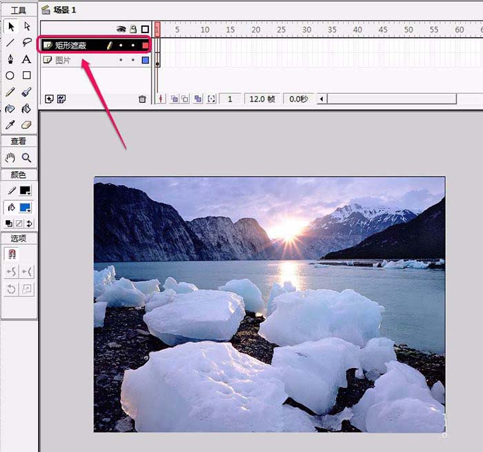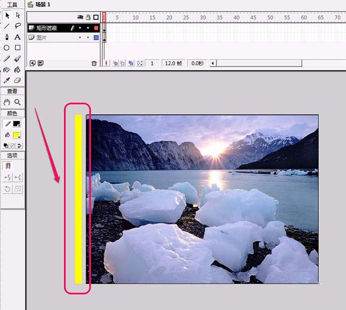 5、在“矩形遮蔽”图层绘制一个矩形。缩小矩形大小,并且把矩形放置在舞台左侧外部区域。